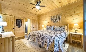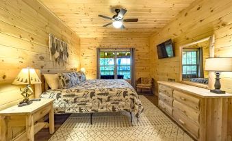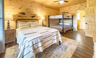 This layout offers privacy for couples and plenty of space for families. You will never get bored when you are staying at Moondance cabin! This cabin offers cornhole, horseshoes, and a fire pit for smores. For rainy days, there are plenty of board games, puzzles, cards, and all the streaming services you can watch.