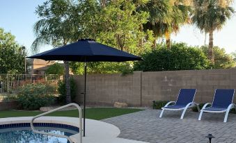 Step out back to a lush resort style backyard with a pool (heated option for additional charge) two patio areas, native Arizona plants and a convenient outdoor shower.