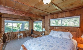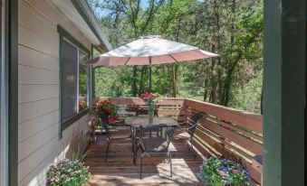 Accommodations: The cabin is equipped with a kitchen, including oven, cook top, microwave, dual sink, refrigerator, pots, pans, utensils, teapot, coffee maker, toaster and much more. There is a washer and dryer in the laundry room. The living area has a dining area with a view of the forest and a living room with a beautiful view of bear creek and the surrounding forest. Wi-Fi and internet access is provided.