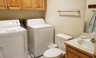 There is a master bathroom off the bedroom downstairs with a jetted tub. The bathroom upstairs also has a jetted tub. The half bath also has a washer and dryer in the room so you can do laundry for longer stays.