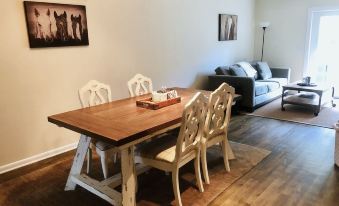 Once you walk through the entry way, passing the downstairs half bath on your right, the space opens up into the dining room and living room. The large wooden farmhouse table provides a beautiful space for sit down dinners. The living room includes space for the group to relax, talk, and watch TV. Apple TV and Comcast (select channels) included. We have everything you need to stay here for an extended, pleasant stay.