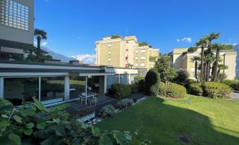 The newly renovated 1½ room apartment on the ground floor of the Condominio Fiori residential complex is in a central location with a direct connection to the Locarno - Orselina cable car. The lake, train station, shopping arcades and old town can be reached in 5 -10 minutes on foot. From the apartment's large balcony you can enjoy the idyll of the garden, the view of the mountains and a piece of the lake. With around 32m2, plus a balcony, the apartment can comfortably accommodate two people. It includes a living room/bedroom with a dining table and opening to the fully equipped kitchen, a hallway with a built-in wardrobe and a bathroom with a walk-in shower. The interior is characterized by practical luxury. A fold-out wall bed and a sofa bed (each 140x200) are available as sleeping accommodations. The comfort includes a stereo system (CD, tape, radio), TV with DVD, WiFi internet stick, dishwasher, fridge-freezer combination, glass ceramic stove, oven, steam hood, toaster, coffee machine, kettle, fondue set, enough crockery, pots and much more. Bed, bathroom and kitchen linen are available. The apartment has a parking space. A covered parking space can be rented upon request. A cot and fan can be provided. The infrastructure of the four buildings of the Condominio Fiori includes a large, ozone-cleaned indoor swimming pool with massage jets, solarium, spacious communal hall, showers, table tennis room, communal laundry room with washing machine and dryer, lift and a very well-kept, subtropical-looking garden with a lawn for sunbathing.