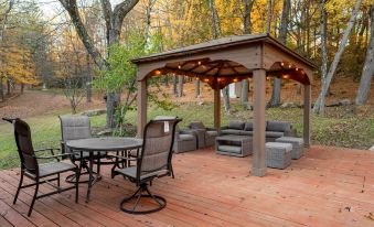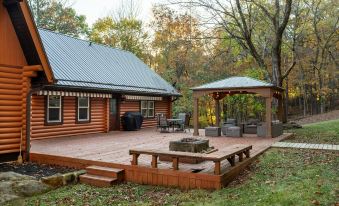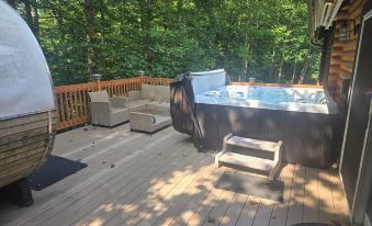 As you approach the cabin from below, following an old park road through the woods, you'll be greeted by an excellent seating space on the front deck in a gazebo or under 2 retractable awnings during rainy days or hot summer. And a stone fire pit to spend a beautiful evenings outside with smores. This is a great spot to get acquainted with the property before entering the cabin, where you'll find a charming open-concept living room, a well-appointed kitchen, and a cozy spacious dining room . The kitchen features stainless steel appliances and granite counter-tops. The fully stocked kitchen has everything needed to prepare and enjoy a dinner "at home" . You can grill out on the gas grill out on the front deck or use the full-size range to whip up a delicious meal. The back porch provides outdoor space and is a nice quiet nook to relax and enjoy the sounds and sights of the forest while using the sauna or a hot tub. When the sun sets, head back to front deck and enjoy the night while sitting around the fire pit with your group.