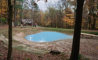 There is a huge outdoor picnic area for gatherings and reunions, or dinner under stars, with covered sitting area with tables, and outside charcoal grill, with huge fire ring for your relaxing enjoyment. Picnic area has lights and can be used in evenings. Kids play house, swing set on site. Beautiful pond,fully fish stocked, with a wood deck overlooking a pond. You can spend some time with your loves ones fishing (catch and release only). The property itself is 65 acres and is yours to explore! There are a lot of trails that are great for hiking, 2 old stone queries to discover and a lot of statues left over from a old state park. Try to find a "LOVE" bridge to a huge stand alone rock with a wood benches, and make the evening "memorable".