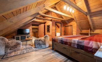 This is a luxury 4500 sf cabin with 5-bedroom, 5-bathroom boasts a walkout basement, two amazing decks, wood sauna and hot tub, and amazing views that will make your travels stress-free. Sleeps up to 15 guests. The main floor living room features sofas arranged around the 2 story stone wood burning fireplace. There is also a half bath on the main floor. by the kitchen. On the main floor is the master bedroom with king bed and master bath, sofa with a TV to spend a private quiet night. The master bath features a freestanding tub, double vanity and walk in shower. Upstairs, there are 2 bedrooms with queen beds and a full bathroom. Across a open loft also a second master with a king bed, siting area with a TV, and a private full bathroom. Heading downstairs to the walkout basement, you'll find a spacious rec room with a big-screen Roku smart TV. The lower level has 1 bedroom with a bunk bed, its a twin over full beds, with a full bathroom, and living room that has a queen sleeper sofa, and another wood stove as well. YouTube TV is available for your enjoyment, and you're welcome to log in to your own streaming services as well. WIRELESS HIGH SPEED INTERNET is available at no cost !!! All towels and linens are provided.
