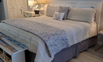 Our cozy, second floor, studio residence has all the amenities of your home away from home. The interior has been updated, including new windows and interior window shutters but will reflect a part of Old Naples that has passed, with hand paintings by a local artist of Gordon Pass before its development and local birds - all combined to provide a fresh coastal cottage feel. This adorable condo residence has a king bed, full kitchen and bath and a table for two!  It will give the residents a feel of a cottage near the beach. There is plenty of room for your personal items with a large built-in wardrobe.  Cable TV, and Internet/WiFi to ensure you are always connected to the outside world should you want to re-connect after a day of swimming in our oversized, heated pool or the beautiful Gulf of Mexico - across the street and just steps from your front door.
