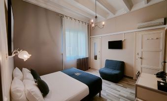 The hotel is within spitting distance of the train station, around the corner from a small Roman ruins site and walkable to the town's main sites. In other words, perfect location when traveling by train. Super clean room and great a/c. Not a fancy hotel, but perfect for the price and location.