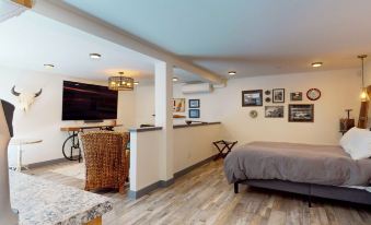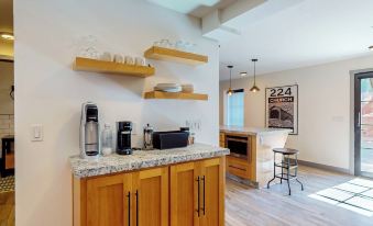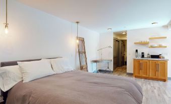 You'll love this industrial modern 1 BR apartment sleeps 2-4. With a loft-style large open floor plan, huge chef's kitchen with massive island and counter seating for 8 there’s plenty of room to spread out and relax. The cushy living room space has a large screen TV and leather sectional. The cook's kitchen has a granite island which seats 8, all high-end KitchenAide appliances and laundry in unit.