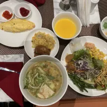 Bữa sáng rất ngon, và tôi đặc biệt thích món đậu xanh xào. Họ cũng có vải thiều tươi, đây là lần đầu tiên tôi thử. Trà Việt Nam cũng rất ngon!