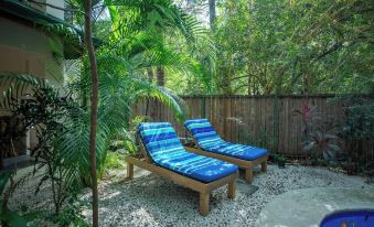 Tierra at Casa Nambi, a one-bedroom apartment with a king-size bed, opens to a terrace, gardens, and the pool. Tierra offers a full and well-equipped kitchen including oven, microwave, blender, toaster, and coffee; ceiling fans, and air conditioners in each room. Tierra is accessed from a gently sloping pathway and has no steps or thresholds; handicap bars are provided in the bathroom and shower. The terrace, equipped with a dinner table, and rocking chairs, looks out to the pool and jungle beyond. The bedroom opens to a private balcony. Security glass windows and doors have pull-down privacy blinds (and black-out blinds for the bedroom). A private and locked surfboard cage is provided, with access to a surfboard waxing/cleaning station.