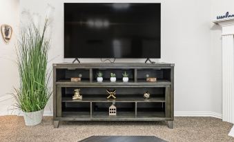 - Living Area: Open-concept with modern décor, smart TV, and cozy seating.