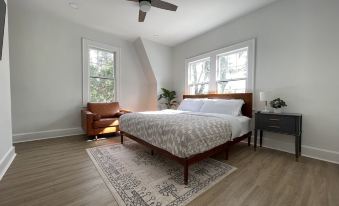 The first bedroom on this level features two queen-sized mattresses, a dresser, and a closet, while the master bedroom boasts a luxurious king bed, walk-in closet, and private bathroom with a standalone bathtub. Both bedrooms upstairs have their own 50-inch Roku television, perfect for a cozy movie night in.