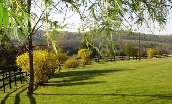 We describe Baldy's as a Retreat because it is almost out of sight and out of earshot of the farm complex. However, a short walk down the drive brings you to additional horse paddocks with friendly horses. Just beyond, you reach the edge of the farm complex, with additional guest cottages, the Manor House, the stables, our Pavilions where we host wedding receptions, the Game Barn, and access to our woodland hiking trails.