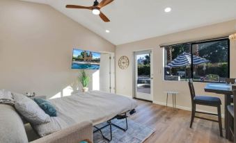 Private suite with (2) full bathrooms and walk in showers. Separate bedroom with king bed, Living room with pull out sleeper couch, dining, and kitchenette. A true oasis in the heart of the Coachella Valley! Centrally located in Palm Desert -one mile from "El Paseo" the Rodeo Drive of the Desert, with luxury dining and upscale shopping!