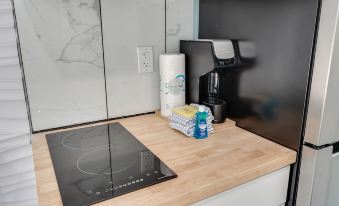 There is a 2 burner electric cooktop, microwave and refrigerator. Please note that there is no oven or dishwasher.