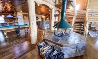Pull into the 3 bay garage (a rare find among rentals in this area!) where you can easily load, unload and store luggage, outdoor gear, groceries and anything else you choose to bring along - without having to step into the variable Colorado weather. Enter the long entry hall of the large cabin and the ground floor of the home which offers a full bathroom with a toilet, vanity, linen closet and corner shower and a central workspace with a desk and comfortable desk chair. The Western Room features a large closet and dresser, a Queen size bed fitted with luxurious cotton bed linens and walkout access to the covered porch and hot tub. The Victorian Room features a corner closet, cozy accent chairs around a small television, a Queen size bed fitted with luxurious cotton bed linens and walkout access to the covered porch and hot tub. Plan a day of activities and then come home to a long, hot soak in the hot tub after a day filled with fun and adventures in the Rocky Mountains. Make your way up the stairs where the open-concept Great Room features breathtaking mountain and woodland views through the floor to ceiling windows of the West wall and from the huge elevated deck where you can take in the epic views with your morning brew. The dining area has a large table with comfortable seating for 6 and a sideboard for ease of serving everyone in your party. Lounge with your loved ones in the spacious living area with comfortable sectional couch, accent chairs and coffee table. The circular, wood burning fireplace is a beautiful addition to this welcoming space and offers a unique touch that can be enjoyed from anywhere in the great room. A mounted dart board and full size pool table will ensure that there is never a dull moment and the nearby wet bar with mini fridge and wine cooler is fully stocked with every cocktail glass you may desire and offers additional high top seating for 3! Conveniently located between the wet bar and the kitchen, the half-bathroom offers a standard vanity and toilet and a roomy laundry closet with full size washer and dryer available for guest use - no need to waste precious vacation time at the laundromat in town!