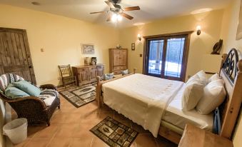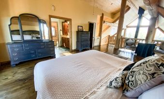 Make your way up the staircase to the spacious master wuite located in the open loft with gorgeous views from every window. The room features a cozy private balcony, breakfast nook for 2 and a king size bed fitted with luxurious cotton bed linens, a vintage armoire, massive walk-in closet and an en suite master bathroom. Slide the double pocket doors closed as you enter the large en suite bathroom that offers a double vanity, corner shower and private toilet.