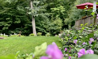 Her wooded canopy will provide wildlife up close. The field across from the cottage may grace you with a new baby calf or you may see the Blue Heron walking down the creek. The sweep of deck or gazebo will allow for hours of outside lounging, games, and grilling.