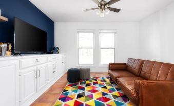A cozy and inviting space with plush seating, a large smart TV, and a decorative fireplace—perfect for a movie night or just relaxing after a day out in Austin.