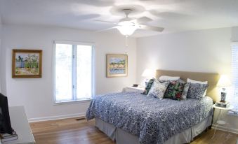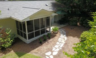 The Timmel House also has a covered screened-in porch with chairs to sit and enjoy a southern evening. Plus, the open patio has a Weber gas grill and grilling tools ready to use at all times. The quaint manicured lawn lends itself to a game of bocce ball or lounging in one of our outdoor chairs.