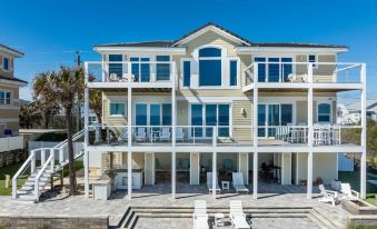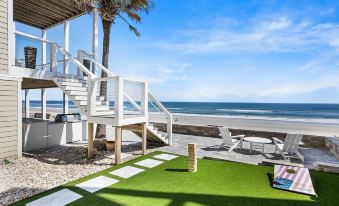 This 4 bedroom, 3 bathroom, 3 level beachfront home is perfect for multi-family gatherings! You'll love the secluded feel of the beach - there are no public access points within a mile in either direction. Watch dolphins play in the surf from one of our three decks. Enjoy the ocean breezes with a tropical drink in hand on the covered patio. Hours of natural entertainment is just steps away down our private stairs to the beach. The boogie boards, sand toys, and beach chairs we provide are easy to bring to the beach from our outdoor storage. Our new flat turf game area is perfect for bocce ball, giant jenga or cornhole games - all provided.