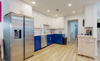 Step inside and be greeted by an open-concept kitchen, dining, and living area. The kitchen is fully equipped with sleek stainless appliances and even a small wine fridge for those special occasions. A laundry room just off the kitchen adds convenience to your stay.