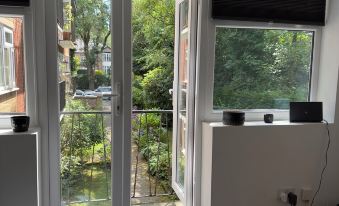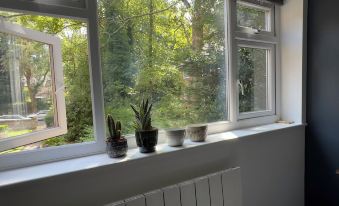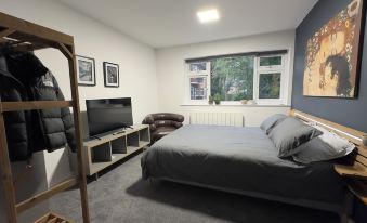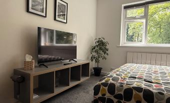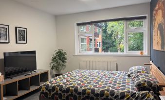 Kingsize room with Garden View. Newly renovated apartment, situated on one of the most beautiful tree lined residential roads in Prestwich, dedicated work area 4k smart TV, free streaming services, beautiful views, 3 Miles to Mcr City Centre, 200Mtr to buses, 10 Minute walk to Tram, J17 Motorway 1 Mile away.