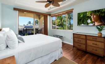 You will enjoy the comfortable open floor plan with kitchen, dining, living room and a large lanai with outdoor kitchen. The kitchen is fully equipped for all of your needs and features granite countertops and stainless-steel appliances. The spacious living room with vaulted ceiling has plenty of seating for your family and a flat screen TV equipped with cable. The dining area seats 4, plus 2 bar stools at the kitchen counter. This home is designed for up to 4 guests, with separate sleeping areas on the first and second floor. The large main upstairs bedroom includes a King-sized bed and ensuite large bathroom, with separate jetted tub and shower, a Smart TV for streaming your favorite programs or movies, and private balcony overlooking the tropical gardens. The Downstairs bedroom features two twin beds, and Smart TV for streaming. Directly next to the downstairs bedroom is a bathroom with tub/shower combo. Modern conveniences such as WiFi, central air conditioning, washer/dryer, dishwasher and a private garage will make your stay comfortable and convenient. Please note that the garage sizes are small & will accommodate compact to midsize cars only.