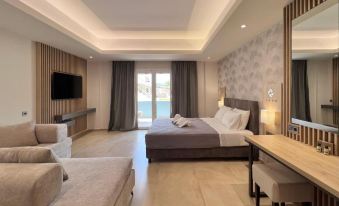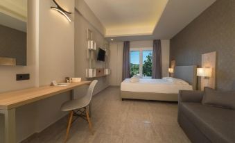 Good sized studio with sea view. Accommodation lacks so much very unloved. Dead plants on tables , gardens not maintained. Bar lacks any vibe and varied opening times . No menus , blank blackboard all felt like they couldn’t be bothered . Strong smell of smoke in reception and breakfast area . Breakfast was okay but again choice varied . Definitely nicer places to stay . There are a lot of steps . Brocken chairs and beds just all lacks general maintenance and love .
