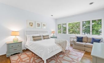 When it’s time to fall asleep, the first-floor primary suite overlooking the water is designed to help you unwind thanks to its king bed, walk-in closet, soaking tub, walk-in shower, and comfortable reading chairs to enjoy a quiet moment. Another first floor en-suite bedroom has a comfortable queen bed and looks out over the rolling front lawn. The second floor presents two spacious en-suite bedrooms with