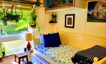 Cascading with plant life that enchants this cozy cottage to feel alive. With splashes of art, books, trinkets and antiques. A rustic tone with hints of modern. This is a Refurbished mini-home nestled within the beautiful forests of Belfast blossoming a lovely river view. The master bedroom offers a queen sized bed with a 50" TV, closets and a calmly forest view. The second bedroom has a daybed with a trundle bed underneath equipped with two twin bed mattresses in total. There is also a small TV and closet space.