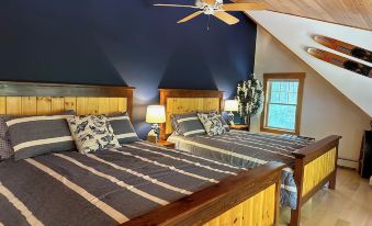 Bedrooms: 1st floor primary bedroom suite (king with ensuite bathroom, living room area and small kitchen), 2nd floor sunny yellow bedroom (king), 2nd floor lake blue bedroom (2 queen), 2nd floor green garden bed room (queen), loft (4 full), secluded bedroom (queen), queen sofa sleeper in family room/game room.