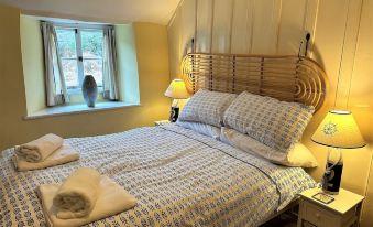 Wooden stairs lead to the first-floor landing of which the three bedrooms and bathroom are separately accessed, through feature panelled doors. The double bedroom has an contemporary rattan furniture, wardrobe and chest of drawers, and bonnet ceiling. The twin bedroom has a bonnet ceiling, with matching cherry wood bedsteads and furniture. The single bedroom has a raised fitted bed, and wooden furniture to match. There is also a large Victorian style shower room, with fitted vanity unit, shower and toilet. The cottage has central heating plus electric fires in the lounge and dining room fireplaces.