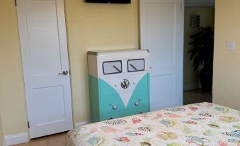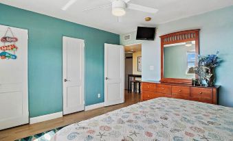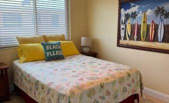 Fun Surfer themed condo with surf boards on the walls and a modern kitchen including a dishwasher and full size stainless steel appliances. Newer updated bathroom. Primary bedroom with king bed, views of the gulf and amazing sunsets! The living room has the same beautiful view of the Gulf of Mexico. The second bedroom has Queen bed. All 3 rooms have a TV.