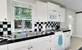 This private cottage is the perfect home away from home to return to after a fun filled day in San Diego! Recently remodeled, 1 Bedroom with Queen size bed, remote controlled A/C, floating live edge wood ledge with bar stools looking out a nice size window into the backyard is a nice laptop friendly workspace, flat screen swivel TV you can watch from bed or at the table, large open closet area with dresser drawers and hangers and cute barn style doors make the bathroom and bedroom areas private. The living area has a sofa where you can relax while you enjoy the fast free Wi-Fi. The fully equipped kitchen provides all of the amenities needed for making and enjoying your own home cooked meals. With pub height table, 3 stools and a charging station this makes a great dining and workspace. You can eat also outside on your own fully fenced and gated private deck, perfect for your furry friends, with a passion fruit vine creating a partial privacy screen, sit at the patio table with 4 chairs and a gated side yard / walkway that you can use as an outdoor storage area - ideal for a bike or surfboard! Step down to the backyard with new Jacuzzi, outdoor kitchen BBQ area with Large sink, counters, Gas fire pit with custom built redwood benches around it, and the laundry room off the backside of the main house down the hallway The front and back yards are a common area for all guests of the property to enjoy.