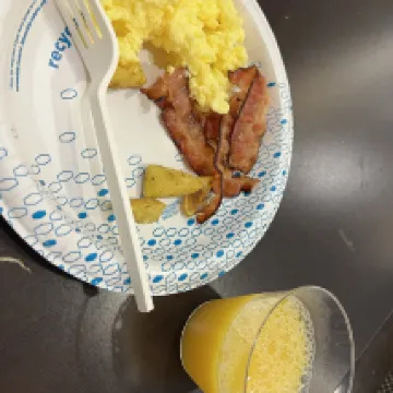 Bữa sáng thật là một thảm họa, có quá nhiều người, đồ ăn nóng hổi là trứng bác, thịt xông khói và khoai tây, việc còn lại là nướng bánh mì và xếp hàng làm bánh quế. . .