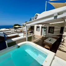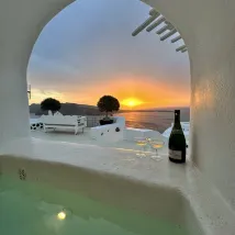 phòng suite tuần trăng mật Sunset với bồn nước nóng riêng và tầm nhìn caldera