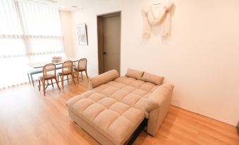 Great location and not far from Hongik Station exit 7 (Airport line), room is clean and nicely furnished which comfortable for a group of 5 people. There’re 2 private bathrooms in each room which is very convenient. However, it’s quite small. Bed is ok, a bit too soft. For those who sleep hard, the curtain is non-blackout, wall is not soundproof which caused us easily wake up at night. Anyway, overall is good.