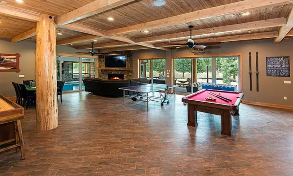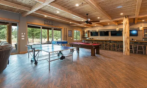 Enormous Game room with 80 inch TV, Rock Fireplace set in front of comfy sectional sofa, Pool table, Ping pong, Shuffleboard, Foosball, card table. Large Bar area with large 4 large 60 inch Flat Screen TVs for that true Sports Enthusiast,, bar seating for 14. Outdoor area complete with Pottery Barn patio furniture surrounding Fire pit, additional dining tables. Large hot tub. Bocce ball court, Horseshoe Pit.
