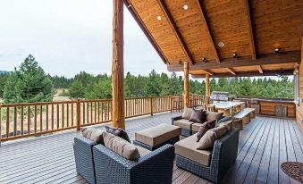 Tons of deck space with high end Patio Furniture from Restoration Hardware and outdoor Fireplace with see through effect. Large wood slab dining table, Built in BBQ, bar stools that allow seating capacity for tons of people. Another Large hot tub.