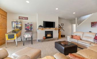 INDOOR LIVING: Multiple flat-screen TV, fireplace, dining table, pool table, shuffle board, pinball machines, vaulted ceilings, open floor plan
