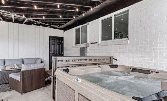 ✔ Hot tub beneath a covered, string-light lit outdoor patio