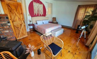 Going up stairs and turning to your left is the Master bedroom. It has direct access to the second balcony, where you can enjoy a panoramic and unobstructed lake view or star gaze at night and see the entire milky way. Inside you can lounge comfortable on a King size mattress and wake up to the full views of the lake. Each bedroom has a portable fan that keeps the space cool and comfortable in the warmer weather. In the cold months the first floor has radiant heat throughout.