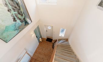 You enter the apartment from street level, accessing the big hallway with plenty of space for your outerwear. Three of the bedrooms are of a large size and located here on the ground floor. The master bedroom has a custom fitted king size bed, a walk-in wardrobe, a fire place and seaview. There is another double bedroom with queen bed, extra sofa bed, and seaview. The third bedroom is located on the street side, and has a queen size bed and optional kids bed. There is also a bathroom with toilet and shower, and a laundry room with washing machine.