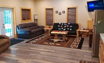 This is right where you want to be, in this private cozy barndominium in the woods. We can accommodate up to 7 people. It has 2 bedrooms, 1.5 baths, laundry rm, full kitchen and dining area.