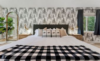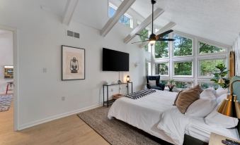 In this home, you'll find 4 beautifully designed bedrooms (each with their own smart TV). Downstairs, the first bedroom has a queen bed, while the second bedroom has a full-over-full bunk. Upstairs, the master bedroom is HUGE, with walls of windows, a king bed, & a private ensuite bathroom. The fourth bedroom is right across the loft, with a queen bed & lots more natural light!
