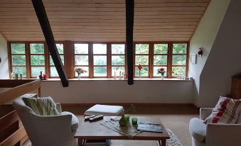 On the large, park-like natural plot (about 8.500 square meters) with old trees, there are large playgrounds, a vegetable and flower garden and a small duck pond. The GAUBENwohnung extends over two floors and offers space for max. 4 people - ideal for couples or a small family.