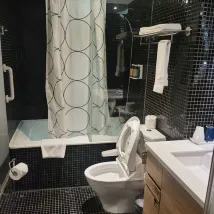 Vị trí hoàn hảo, chỉ cần đi bộ vài phút trên con đường yên tĩnh đến Lối ra 5 của một ga tàu điện ngầm có hai tuyến. Có nhiều nơi khác trong phạm vi đi bộ. Có một số điểm trừ nhỏ nhưng đây là lựa chọn tầm trung sạch sẽ, thoải mái mà tôi có thể sẽ quay lại. Vòi hoa sen là khía cạnh ít thỏa đáng nhất và cũng đáng lưu ý rằng nếu bạn bị hạn chế khả năng vận động thì hầu như không thể trèo qua bức tường bồn tắm cao và rộng để tắm! Chỉ có một số điểm trừ nhỏ khiến lưng tôi đau, và việc trèo ra ngoài khi mọi thứ đều trơn trượt khá nguy hiểm. Tôi đã thở phào nhẹ nhõm vào lần cuối cùng tôi làm điều đó!