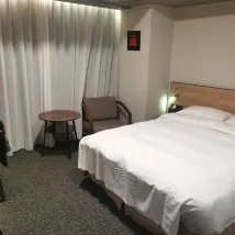 Tiện nghi trong phòng: Thiết kế phòng không sang trọng, thiết kế phòng đơn giản, không lớn lắm nhưng được trang bị đầy đủ tủ quần áo/tủ lạnh mini/tủ quần áo/toilet dùng một lần/phòng tắm/TV tách khô và ướt, đáp ứng nhu cầu hàng ngày.