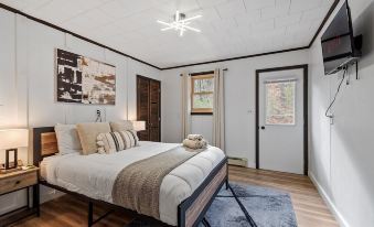 Inside, you'll find two cozy bedrooms with queen beds, a bunk room with private bathroom, and a spacious loft featuring two full beds. Perfect for families and groups looking for comfort and relaxation in the heart of nature.